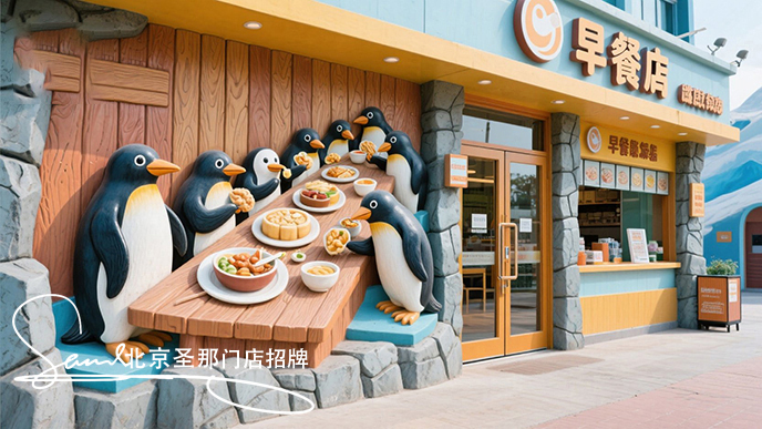 項目描述:門吊招牌以“冰川早餐”為主題,將南冰洞與早餐文化相結(jié)合,營造出一幅奇幻的場景:一群企鵝圍坐在冰桌旁用餐。通過展現(xiàn)可愛的形象來突出重點內(nèi)容,便于人們記憶。