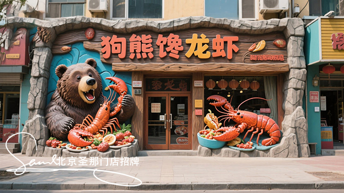 項目描述:門吊招牌以“熊霸的深海盛宴”為核心理念,顛覆傳統(tǒng)海鮮店形象,打造狗熊劫持龍蝦寶藏的奇幻場景,引發(fā)強社交傳播。