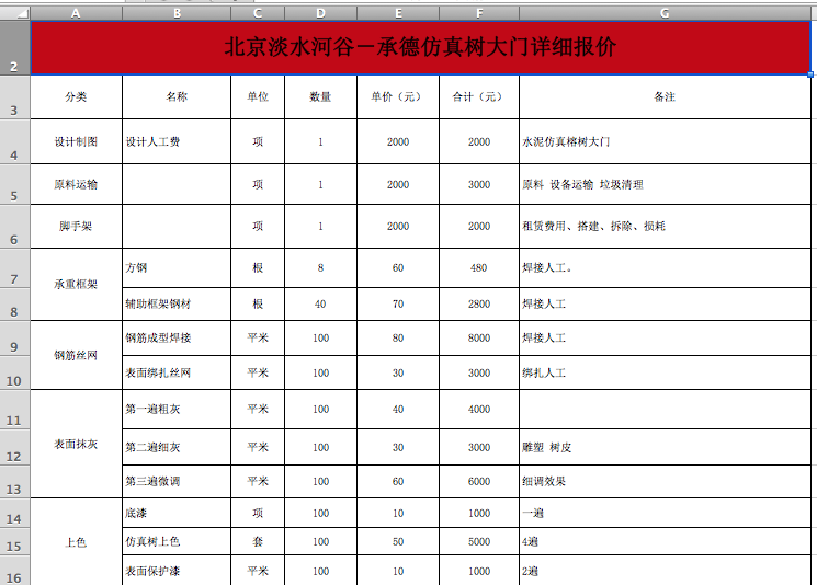 項(xiàng)目描述:仿真樹(shù)大門詳細(xì)報(bào)價(jià)按照整個(gè)仿真樹(shù)大門所用人、材、機(jī)的方式報(bào)價(jià)。其中把材料中的鋼材、水泥、顏色等進(jìn)行詳細(xì)等劃分,細(xì)致到每棵仿真樹(shù)大門的每個(gè)細(xì)節(jié)所用的人工、材料等,方便以后客戶及同行使用。