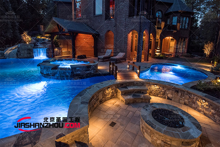 華麗的現(xiàn)代建筑與自然背景相結合,為該水泥塑石假山園林景觀區(qū)提供了佳的背景。地板被澆注水泥,兩者之間有縫隙,允許草在其中生長。家具件是堅固的耐候木材,帶有米色座墊和木制壁爐,使其看起來與木制建筑f 格相得益彰。