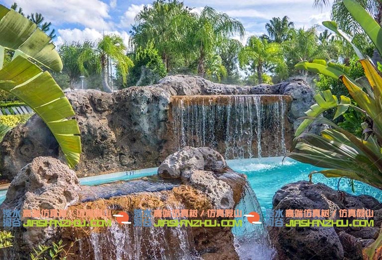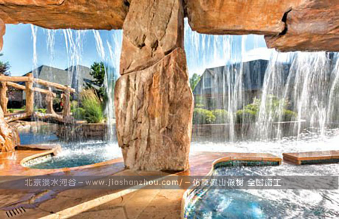 5、塑石假山經(jīng)常流水的部位上色:模仿自然的手法,把調(diào)制好的暗色色漿從物體頂部像下雨一樣,任其流動所形成的顏色效果,在調(diào)制色漿時要注意,色漿要調(diào)制得很稀,不要調(diào)制很稠,要經(jīng)過多遍的流淌達到自然的效果。6、表面亮色:在塑石假山的凸出部位噴涂淺色色漿,形成亮、暗對比的效果。