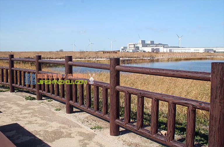 北京廠家為使客戶能簡單區(qū)分繁雜的仿木欄桿外型,采用象形命名的方法,把兩根立柱間有三根橫梁、五根豎梁的仿木欄桿命名為三段五豎圓形仿木欄桿。