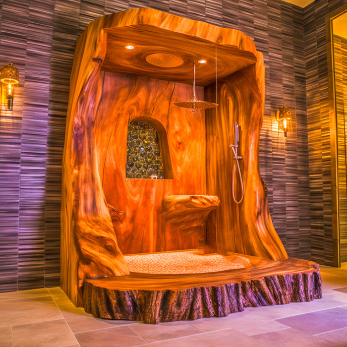 民宿仿木淋浴室的優(yōu)點(diǎn)是仿佛在野外瀟灑